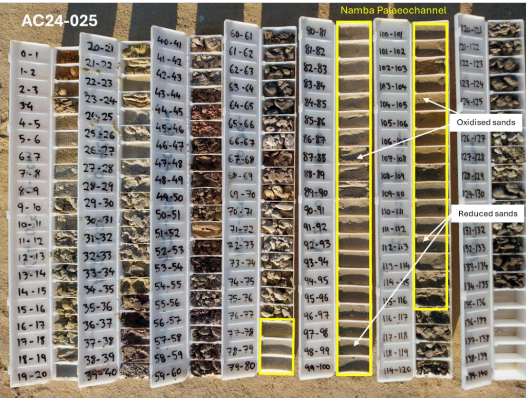 Empat lubang bor inti udara memotong unit pasir saluran palaeochannel yang menampung mineralisasi uranium yang tidak wajar yang terletak antara 90m dan 130m di bawah permukaan.