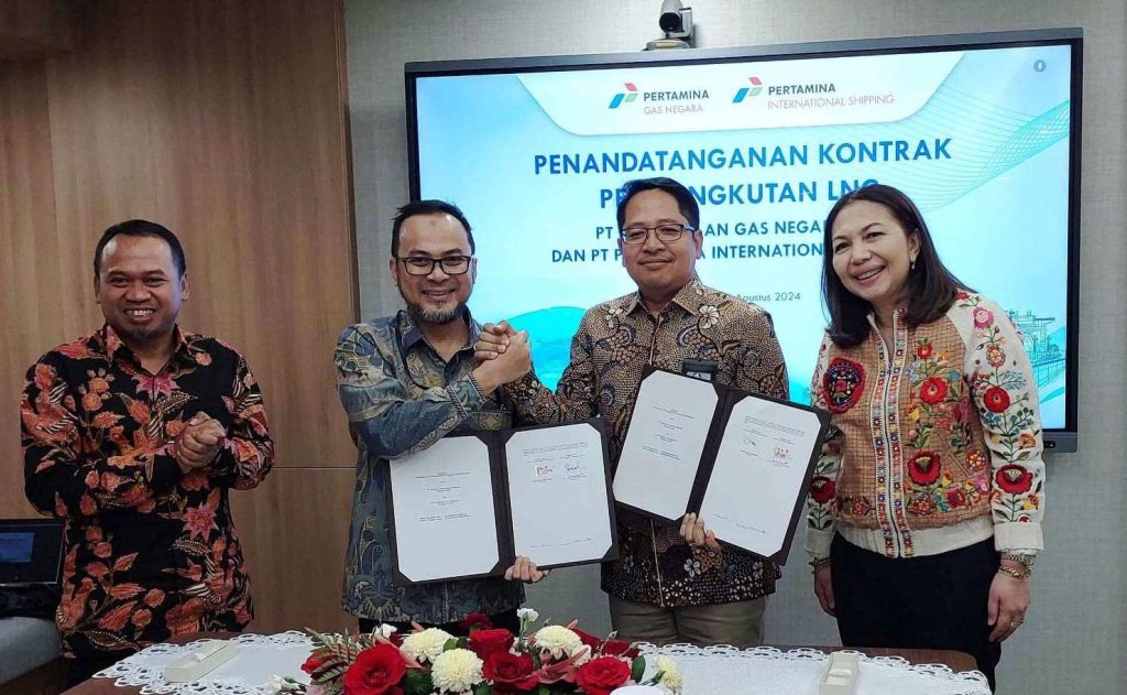 Jakarta, – Sinergi antar Subholding Pertamina kembali terjalin dalam rangka mengamankan energi nasional, khususnya gas bumi. PT Perusahaan Gas Negara Tbk (PGN) selaku Subholding Gas dan PT Pertamina Internasional Shipping (PIS) selaku Subholding Integrated Marine Logistics menandatangani kontrak pengangkutan Liquefied Natural Gas (LNG) Kargo dari Donggi Senoro menuju Floating Storage & Regasifation Unit (FSRU) di Lampung.