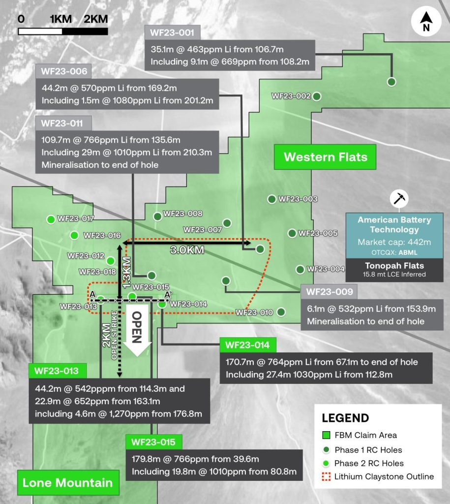 Perusahaan kapitalisasi pasar senilai $59,19 juta ini berfokus pada prospek Lone Mountain, di mana batulempung litium dangkal yang tebal telah ditemukan pada jarak 3 km kali 1,3 km dan tetap terbuka hingga 2 km ke selatan.