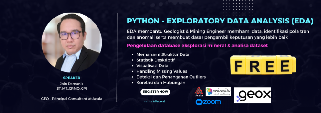 Dengan menggunakan Python dalam EDA dalam pengelolaan database eksplorasi mineral dan Batubara, Anda dapat memanfaatkan keunggulan bahasa ini dalam kemudahan penggunaan, library yang kuat, integrasi dengan database, fleksibilitas analisis data, dan dukungan komunitas yang luas. Hal ini memungkinkan Anda untuk menjalankan analisis data secara efisien, menggali wawasan dari dataset eksplorasi mineral, dan mendukung pengambilan keputusan yang lebih baik dalam kegiatan eksplorasi dan pengelolaan sumber daya mineral.