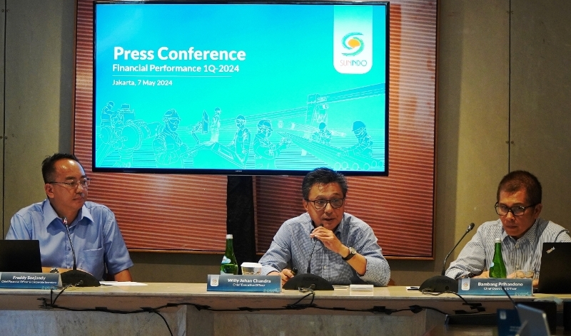 Direktur Utama SUNI, Willy Johan Chandra (tengah), didampingi CFO dan Corporate Secretary SUNI, Freddy Soejandy (kiri), dan Direktur Operasional SUNI, Bambang Prihandono (kanan), saat memaparkan kinerja SUNI sepanjang Kuartal I-2024, Selasa (7/5).