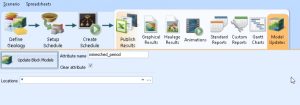 STEP 2: In the Publish Results ribbon choose the Model Updates tab. You can select a name for the new attribute it will create in the block model, or use the default minesched_period. Make sure option for Clear attribute is checked on, this will eliminate any risk of combining the results of multiple exports to the block model. Hit the button to Update Block Models.