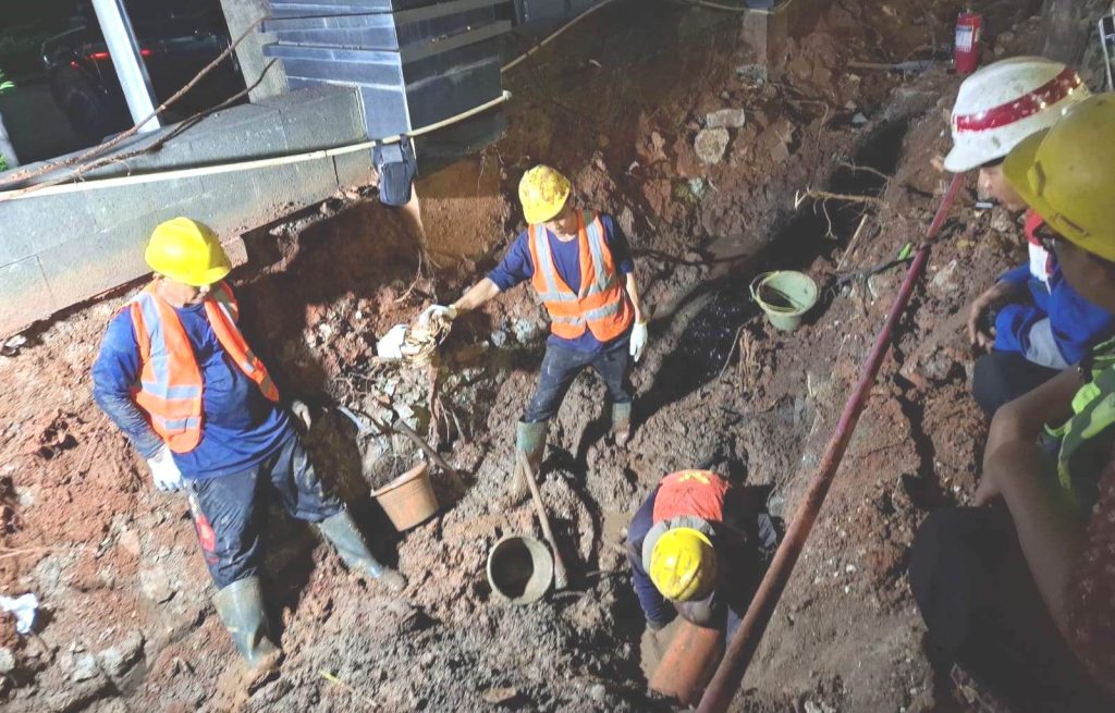 Dugaan sementara, kebocoran pada material pipa PE 180 MM disebabkan oleh aktivitas pihak ketiga yang tengah melakukan penggalian utilitas lain.